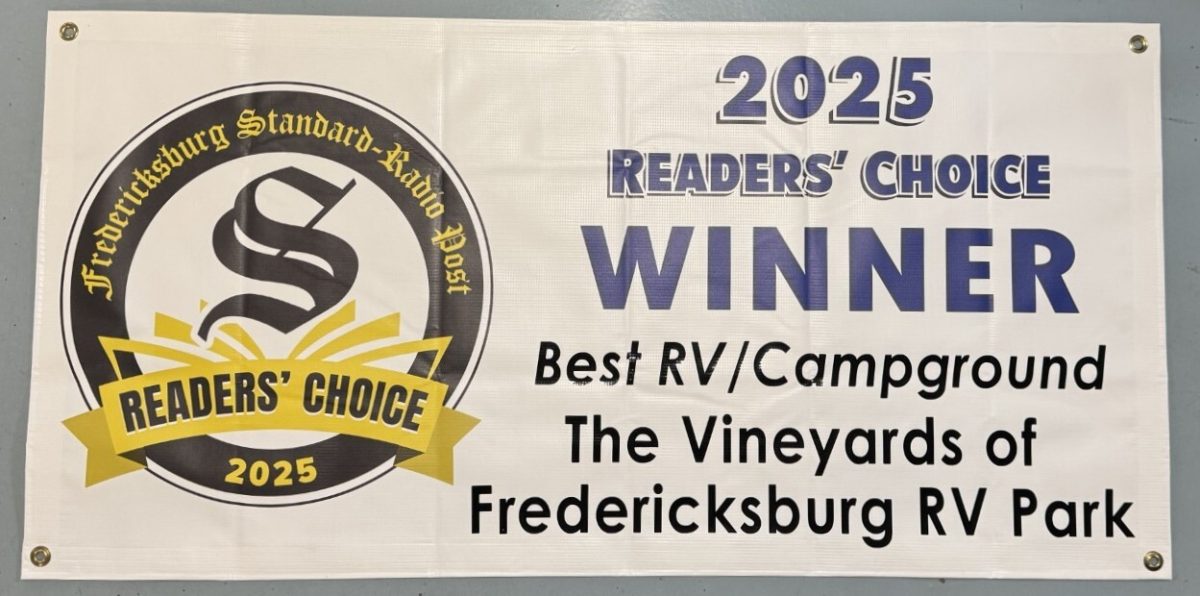The Vineyards of Fredericksburg is a new RV Park located in the central Texas hill country town of Fredericksburg, a destination known for quaint German architecture, cuisine, and shopping, as well as for vineyards, wineries, and scenic beauty. Our top-rated campground will wow you with its pastoral views and rich amenities. This is a getaway you’ll want to return to again and again. Voted 2022, 2023, and 2025 Readers’ Choice “Best RV Park in Fredericksburg” by the Fredericksburg Standard and BusinessRate’s Top 5 RV Parks in Fredericksburg.
